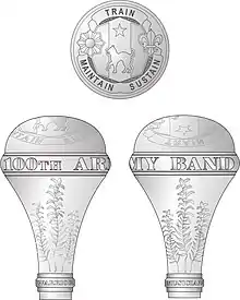 The 100th Army Band has its own collection of heraldric devices,[19] including a baldric, mace, tabard, drum design and unit tab for wear on the uniform.