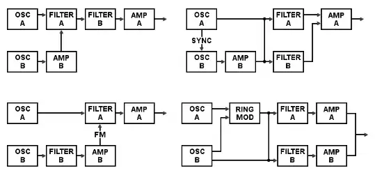 A Chroma sound program can be composed of two oscillators, filters and amplifiers in one of fifteen different configurations.[13] Each configuration connects (or patches) the oscillators, filters and amplifiers together in different ways to provide for a wide variety of possible sounds. For example, filters can be arranged in series for 4 pole or band-pass response, or in parallel for notch filtering. In addition, some configurations feature oscillator synchronization, filter frequency modulation or ring modulation.