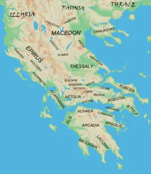 In the south lay the Peloponnese, consisting of the regions of Laconia (southeast), Messenia (southwest), Elis (west), Achaia (north), Korinthia (northeast), Argolis (east), and Arcadia (center). These names survive to the present day as regional units of modern Greece, though with somewhat different boundaries. Mainland Greece to the north, nowadays known as Central Greece, consisted of Aetolia and Acarnania in the west, Locris, Doris, and Phocis in the center, while in the east lay Boeotia, Attica, and Megaris. Northeast lay Thessaly, while Epirus lay to the northwest. Epirus stretched from the Ambracian Gulf in the south to the Ceraunian Mountains and the Aoos river in the north, and consisted of Chaonia (north), Molossia (center), and Thesprotia (south). In the northeast corner was Macedonia,[63] originally consisting Lower Macedonia and its regions, such as Elimeia, Pieria, and Orestis. Around the time of Alexander I of Macedon, the Argead kings of Macedon started to expand into Upper Macedonia, lands inhabited by independent Macedonian tribes like the Lyncestae, Orestae and the Elimiotae and to the west, beyond the Axius river, into Eordaia, Bottiaea, Mygdonia, and Almopia, regions settled by Thracian tribes.[64] To the north of Macedonia lay various non-Greek peoples such as the Paeonians due north, the Thracians to the northeast, and the Illyrians, with whom the Macedonians were frequently in conflict, to the northwest. Chalcidice was settled early on by southern Greek colonists and was considered part of the Greek world, while from the late 2nd millennium BC substantial Greek settlement also occurred on the eastern shores of the Aegean, in Anatolia.