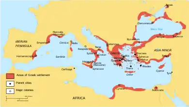 Colonisation of the Mediterranean by the 6th century BC: Phoenician settlements in red, Greek areas in blue, and other territories as marked.