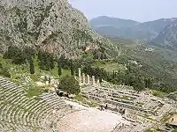 The Theatre and Temple of Apollo in mountainous country at Delphi