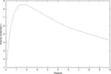 The angular size redshift relation for a Lambda cosmology, with on the vertical scale megaparsecs.
