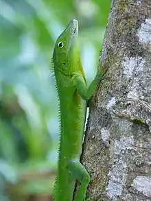 These are anoles which inhabit the uppermost canopy of trees, they all share certain morphological characteristics such as relatively large body size, large heads, large sub-digital lamellae and serrated dorsal crest; most species are predominantly green. Crown giant anoles can be informally subdivided into long-legged species (which move by jumping from tree to tree) and short-legged species (which do not often jump and mostly crawl from one area to another). Because of their large size, these anoles can take a wide range of prey items from smaller lizards to small birds; all species are also known to consume fruit. Though they all share a similar body plan, crown giant anoles vary significantly in size from one island to the other. A few examples of crown giant anoles are shown below.