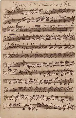 The sonatas and partitas for solo violin (BWV 1001–1006) are a set of six works composed by Johann Sebastian Bach. They are sometimes referred to in English as the sonatas and partias for solo violin in accordance with Bach's headings in the autograph manuscript: "Partia" (plural "Partien") was commonly used in German-speaking regions during Bach's time, whereas the Italian "partita" was introduced to this set in the 1879 Bach Gesellschaft edition, having become standard by that time.[1] The set consists of three sonatas da chiesa in four movements and three partitas (or partias) in dance-form movements. The 2nd Partita is widely known for its Chaconne, considered one of the most masterly and expressive works ever written for solo violin.[2]