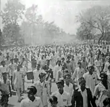 Disorder spread across the province as large processions ignored section 144 and condemned the actions of the police.[26] More than 30,000 people congregated at Curzon Hall in Dhaka. During the continued protests, police actions led to the death of four more people. This prompted officers and clerks from different organisations, including colleges, banks and the radio station, to boycott offices and join the procession.[33] Protesters burned the offices of two leading pro-government news agencies, the Jubilee Press and the Morning News.[48] Police fired on a major janaza, or mourning rally, as it was passing through Nawabpur Road. The shooting killed several people including activist Sofiur Rahman and a nine-year-old boy named Ohiullah.[15][49]