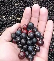 The fruit is a berry 5–16 mm (31658 in) in diameter with a flared crown at the end; they are pale greenish at first, then reddish-purple, and finally uniformly blue when ripe.[8] They are covered in a protective coating of powdery epicuticular wax, colloquially known as the "bloom".[7] They generally have a sweet taste when mature, with variable acidity.[7][8] Blueberry bushes typically bear fruit in the middle of the growing season: fruiting times are affected by local conditions such as climate, altitude and latitude, so the time of harvest in the northern hemisphere can vary from May to August.[7][8]