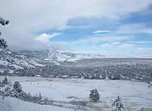 Boulder has a temperate climate typical for much of the state and receives many sunny or mostly sunny days each year. Under the Köppen climate classification, the city is considered semi-arid (Köppen BSk) or humid subtropical (Köppen Cfa) as it falls near that precipitation boundary, due to its relatively high yearly precipitation and average temperatures remaining above 32 °F (0 °C) year-round.[31][32][33][34] Winter conditions range from generally mild to the occasional bitterly cold, with highs averaging in the mid to upper 40s °F (7–9 °C). There are 4.6 nights annually during which the temperature reaches 0 °F (−18 °C). Because of orographic lift, the mountains to the west often dry out the air passing over the Front Range, often shielding the city from precipitation in winter, though heavy snowfalls may occur. Snowfall averages 88 inches (220 cm) per season, but snow depth is usually shallow; a strong warming sun due to the high elevation can quickly melt snow cover during the day, and Chinook winds bring rapid warm-ups throughout the winter months. Summers are warm, with frequent afternoon thunderstorms. Roughly 30 days reach 90 °F (32 °C) or above each year.[35] Diurnal temperature variation is typically large due to the high elevation and semi-arid climate. Daytime highs are generally cooler than those of most Colorado cities with similar elevations. However, Boulder's nighttime lows are mild, particularly during winter. The average January temperature of 34.5 °F (1.4 °C) is the warmest of any city in the state.[36] The highest recorded temperature of 104 °F (40 °C) occurred most recently on June 25, 2012.[37] The record low was −33 °F (−36 °C) on January 17, 1930. The coldest high temperature, −12 °F (−24 °C), was recorded on February 4, 1989, while the warmest overnight low was recorded on July 20, 1998, with a temperature of 82 °F (28 °C)[38]