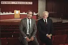 Chase was one of the original cast members of Saturday Night Live (SNL), NBC's late-night comedy television show, beginning in October 1975. During the first season, he introduced every show except two, with "Live from New York, it's Saturday Night!" The remark was often preceded by a pratfall, known as "The Fall of the Week". Chase became known for his skill at physical comedy. In one comedy sketch, he mimicked a real-life incident in which President Gerald Ford accidentally tripped while disembarking from Air Force One in Salzburg, Austria.[24][25] This portrayal of President Ford as a bumbling klutz became a favorite device of Chase's, and helped form the popular concept of Ford as being a clumsy man.[26] In later years, Chase met and became friendly with President Ford.[26][27]