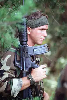 The U.S. Army Ranger in the foreground is armed with an M-16 A1 carbine (Model 653).
