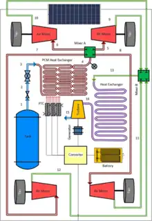 - 1 2 3 Evrin, Reza Alizade; Dincer, Ibrahim (2020). "Experimental investigation of a compressed air vehicle prototype with phase change materials for heat recovery". Energy Storage. onlinelibrary.wiley. 2 (5). doi:10.1002/est2.159. S2CID 219020514. Retrieved 2020-04-27.