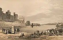 A lithograph entitled "Conway Bridge" showing the second wrought-iron box girder tube being floated into position, c. September 1848.