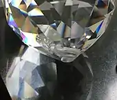 A decorative glass crystal about 4 cm (1.6 in) in diameter, having a facet cut often applied for gemstones. At some positions, coloured light (see rainbow colouring) can be regarded caused by the intended optical prism effect of the cut.