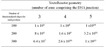The center of the DNA junction constitutes a volume on the order of a yoctoliter, hence the name YoctoReactor. This volume contains a single molecule reaction yielding reaction concentrations in the high mM range. The effective concentration facilitated by the DNA greatly accelerates chemical reactions that otherwise would not take place at the actual concentration several orders of magnitude lower.