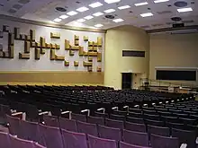 The hall housed the largest auditorium on campus which originally seated 998 people and was generally divided into two large lecture classes.[11] Four of the first floor class rooms were also redesigned in 2013 in order to create better faculty-student interaction and a more collaborative learning space.[12][13] A $7.4 million renovation of David Lawrence Hall was undertaken in 2014. The main lecture hall was split into two separate lecture halls which were reopened in 2015 with improved acoustics and capacities of 571 and 332 each.[14] Three new 50-seat classrooms were added to the second floor mezzanine, and the main lobby was overhauled.[15]