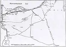 About 10,000 Egyptian Camel Transport Corps camels concentrated at Romani as well as innumerable troops prior to the attack.[20][21] Until more camel transport was accumulated at Romani and Pelusium for the distribution of supplies and drinking water from railhead, the firepower of the main defences could only be increased by moving up the machine gun companies of 53 and 54 Divisions.[22]