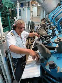An engine department or engineering department is an organizational unit aboard a ship that is responsible for the operation, maintenance, and repair of the propulsion systems and the support systems for crew, passengers, and cargo.[1] These include the ship engine, fuel oil, lubrication, water distillation, separation process, lighting, air conditioning, and refrigeration.