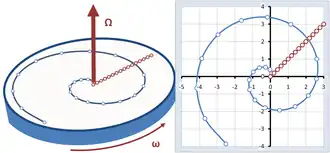 Figure 5 shows another example comparing the observations of an inertial observer with those of an observer on a rotating carousel.[45] The carousel rotates at a constant angular velocity represented by the vector Ω with magnitude ω, pointing upward according to the right-hand rule. A rider on the carousel walks radially across it at a constant speed, in what appears to the walker to be the straight line path inclined at 45° in Figure 5. To the stationary observer, however, the walker travels a spiral path. The points identified on both paths in Figure 5 correspond to the same times spaced at equal time intervals. We ask how two observers, one on the carousel and one in an inertial frame, formulate what they see using Newton's laws.