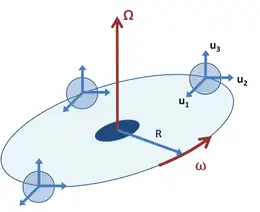 As a combination example, Figure 4 shows a coordinate system B that orbits inertial frame A as in Figure 3, but the coordinate axes in frame B turn so unit vector u1 always points toward the centre of rotation. This example might apply to a test tube in a centrifuge, where vector u1 points along the axis of the tube toward its opening at its top. It also resembles the Earth–Moon system, where the Moon always presents the same face to the Earth.[41] In this example, unit vector u3 retains a fixed orientation, while vectors u1, u2 rotate at the same rate as the origin of coordinates. That is,