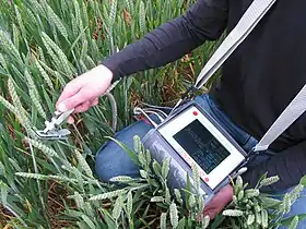 Fluorometers are widely used in oceanography to measure chlorophyll concentrations based on chlorophyll fluorescence by phytoplankton cell pigments. Chlorophyll fluorescence is a widely-used proxy for the quantity (biomass) of microscopic algae in the water. In the lab after water sampling, researchers extract the pigments out of a filter that has phytoplankton cells on it, then measure the fluorescence of the extract in a benchtop fluorometer in a dark room.[7] To directly measure chlorophyll fluorescence "in situ" (in the water), researchers use instruments designed to measure fluorescence optically (for example, sondes with extra electronic optical sensors attached). The optical sensors emit blue light to excite phytoplankton pigments and make them fluoresce or emit red light. The sensor measures this induced fluorescence by measuring the red light as a voltage, and the instrument saves it to a data file. The voltage signal of the sensor gets converted to a concentration with a calibration curve in the lab, using either red-colored dyes like Rhodamine, standards like Fluorescein, or live phytoplankton cultures.[8]