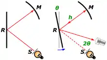 However, if the mirror R is rotating, it will have moved slightly in the time it takes for the light to bounce from R to M and back, and the light will be deflected away from the original source by a small angle, forming an image to the side of the slit.[8]