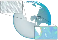 A geodesic grid is a global Earth reference that uses triangular tiles based on the subdivision of a polyhedron (usually the icosahedron, and usually a Class I subdivision) to subdivide the surface of the Earth. Such a grid does not have a straightforward relationship to latitude and longitude, but conforms to many of the main criteria for a statistically valid discrete global grid.[9] Primarily, the cells' area and shape are generally similar, especially near the poles where many other spatial grids have singularities or heavy distortion. The popular Quaternary Triangular Mesh (QTM) falls into this category.[10]