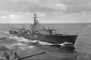 Algonquin was modernized to a Type 15 frigate at Esquimalt and recommissioned on 25 February 1953 with the hull number 224. She was not selected for duty in the Korean War and was instead posted to CFB Halifax on the North Atlantic coast where she spent much of the next 14 years working with Canada's NATO allies.[5] The First Canadian Escort Squadron came into being on 10 November 1953 as part of Atlantic Command with Algonquin as its flagship. The squadron was initially composed of Algonquin and the Prestonian-class frigates Lauzon, Prestonian and Toronto.[33] In September the First Canadian Escort Squadron took part in the NATO naval exercise "New Broom II" and in October "Morning Mist" before performing a two-month training cruise in the Mediterranean Sea, making several port visits.[34][35] The squadron returned to Canada on 10 December 1954.[35] In January 1958, Algonquin collided with HMCS Nootka while operating in the Atlantic with the First Canadian Escort Squadron.[36]
