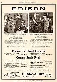 Once he joined Edison in August 1909, Yost performed in only two shorts for the remainder of that year: in the comedy Ethel's Luncheon, released on September 3, and the drama The Little Sister, released on September 14.[20] In both films Yost is credited as Bertram Yost rather than by his previously noted screen name Barry O'Moore. After the release of those shorts, he took time away from films to return to stage acting. Upon his return to Edison in 1912, he began performing again in studio productions and was then credited consistently as Barry O'Moore. From 1912 through 1914, Yost was cast in nearly 90 one-reelers for Edison and in a wide assortment of roles, including as the character Nelson Wales in a series of dramatic shorts.[21]