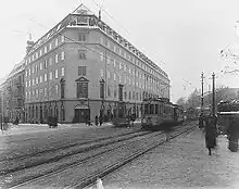 The tramways of Oslo experienced a higher ridership and several sabotage actions during the Second World War.[32] During the "April Days of 1940", rumour had it that Oslo was going to be bombed, and the tram service was therefore stopped for half an hour that day.[33] Later, on 19 December 1943, an explosion at the ammunition supply at Filipstad caused a total stop of tramway service from 14:30 a.m.[34] A small explosion accident also took place at Vålerenga Depot in December 1944.[35] On 31 December 1944, a tram was hit by an airbomb at Drammensveien (now Henrik Ibsens gate) next to the Palace Park, where all passengers but the conductor were killed.[35]