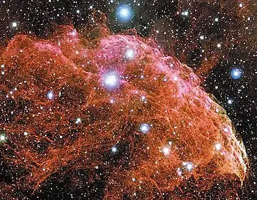 The remnant's age is still uncertain. There is some agreement that the progenitor supernova happened between 3,000[3] and 30,000[5] years ago. Recent Chandra[6] and XMM-Newton[7] observations identified a plerion nebula, close to the remnant southern rim. The point source near the apex of the nebula is a neutron star, relic of a SN explosion. The location in a star forming region and the presence of a neutron star favor a Type II supernova, the ultimate fate of a massive star, as the progenitor explosion.