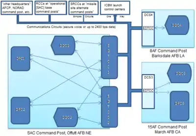 SACCS "was delivered to Strategic Air Command by the contractor in March 1965"[15] and was designed to survive nuclear attack and to provide rapid transmission, processing, and display of information to support command and control of SAC's geographically separated forces.[14] On January 1, 1968, the SACCS attained operational capability[22] (maintenance at Offutt and March were by the respective 55th Strategic and 33rd[23] Communications Squadrons.) During construction of NORAD's nuclear bunker, SAC's 1963 plan for construction of a Deep Underground Command Center in Colorado beginning in 1965 was cancelled.