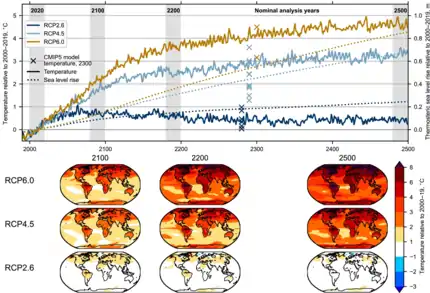 - ↑ Lyon, Christopher; Saupe, Erin E.; Smith, Christopher J.; Hill, Daniel J.; Beckerman, Andrew P.; Stringer, Lindsay C.; Marchant, Robert; McKay, James; Burke, Ariane; O’Higgins, Paul; Dunhill, Alexander M.; Allen, Bethany J.; Riel-Salvatore, Julien; Aze, Tracy (2021). "Climate change research and action must look beyond 2100". Global Change Biology. 28 (2): 349–361. doi:10.1111/gcb.15871. hdl:20.500.11850/521222. ISSN 1365-2486. PMID 34558764. S2CID 237616583.