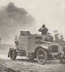 Another early armored car of the period was the French Charron, Girardot et Voigt 1902, presented at the Salon de l'Automobile et du cycle in Brussels, on 8 March 1902.[12] The vehicle was equipped with a Hotchkiss machine gun, and with 7 mm (0.28 in) armour for the gunner.[13][14]