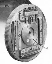 Directly behind the mold disk is the crucible, which contains molten type metal at an optimal 535 °F. At the moment before casting, the mold disk moves forward on its slide. Studs in the mold disc engage with blocks on the vise so that the mold disc seats gently, yet tightly and squarely against the line of matrices held in the first elevator jaws and between the vise jaws. The vise jaws compress the line of matrices so molten metal is prevented from squeezing between the mats on cast. The crucible tilts forward, forcing the mouthpiece tightly against the back of the mold. The plunger in the well of the crucible quickly descends, forcing the molten metal up the crucible throat and injecting it into the mold cavity through the array of orifices in the mouthpiece. The jets of molten metal first contact against the casting face of the matrices, and then fills the mold cavity to provide a solid slug body.[18] These have character shapes punched into them, so the result is a cast slug with the character shapes of the line on its top face. The mold disk is sometimes water-cooled, and often air-cooled with a blower, to carry away the heat of the molten type metal and allow the cast slugs to solidify quickly.[19]
