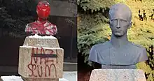 The bronze bust[3] of Ukrainian nationalist leader Roman Shukhevych, who collaborated with the Nazis from February 1941 to December 1942 as commanding officer of the Nachtigall Battalion in early 1941,[4] and as a Hauptmann of the German Schutzmannschaft 201 auxiliary police battalion in late 1941 and 1942,[5] units which were complicit in the Galicia-Volhynia massacres of ethnic Poles and in the Lviv pogroms (1941) against Jews. The bust was built in 1972 by Ukrainian World War II veterans on private land near the Ukrainian Youth Unity Complex in Edmonton, Alberta.[6][7][8][9] The statue was vandalised in 2019 when someone added the words "Nazi scum".[10] It was vandalised again in 2021 when someone added the words "Actual Nazi" in red paint.[7]