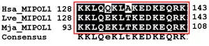 The following post-translational modifications are predicted using bioinformatics tools for MIPOL1.[17] Multiple phosphorylation sites are predicted for this protein, that are conserved in close orthologs, including a Casein kinase 1 (CK1) site, three Casein kinase 2 (CK2) sites, and three NEK2 sites.[18]