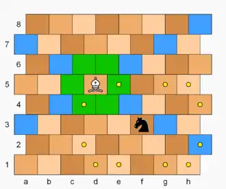 The bishop can move on diagonals to any blue-colored cell in the diagram, or one step as a rook to any green-colored cell. The knight can move to any yellow dot, or it can capture the bishop.