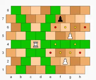 The rook can move to any green-colored cell in the diagram. The white pawn on f2, since it has not yet moved, has four move options (yellow dots) and two ways to capture (red dots). The white pawn on g5 has moved from its initial cell, so has two forward move options and two ways to capture. If Black moves his f7-pawn to either e6 or e5, White can capture it, for example: 1... e5 2. g5xe6 e.p.