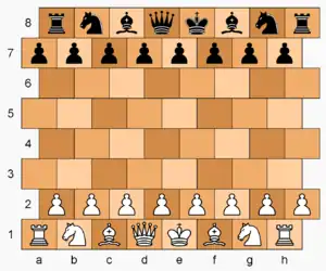 The diagram shows the starting setup. All normal chess rules apply, including conventions for castling either kingside or queenside, a pawn's initial two-step option, en passant captures, promotion, and so on, but the pieces have specially defined moves.