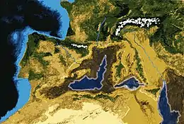 - ↑ Garcia-Castellanos, D.; Estrada, F.; Jiménez-Munt, I.; Gorini, C.; Fernàndez, M.; Vergés, J.; De Vicente, R. (2009). "Catastrophic flood of the Mediterranean after the Messinian salinity crisis". Nature. 462 (7274): 778–781. Bibcode:2009Natur.462..778G. doi:10.1038/nature08555. PMID 20010684. S2CID 205218854.
