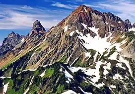 Mount Larrabee is a 7,865-foot (2,397-metre) Skagit Range mountain summit situated 1.4 mile south of the Canada–United States border, in the North Cascades of Washington state. It is located immediately southeast of American Border Peak within the Mount Baker Wilderness, which is part of the Mount Baker-Snoqualmie National Forest, and near North Cascades National Park. It is notable for its reddish coloring caused by oxidation of Iron in the rock. The rock consists of reddish interbedded and interfolded phyllites and greenstone.[2] Originally known as Red Mountain, the name was changed in 1951 to honor Charles F. Larrabee (1895–1950), of the prominent Larrabee family of Bellingham, Washington.[3] The name was officially adopted in 1951 by the U.S. Board on Geographic Names.[3]