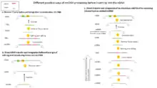 As shown in figure 2, there are three possible ways that mtDNA can become prepared to be inserted into the nuclear DNA. The process mainly depends on the time mtDNA transfers into the nucleus.[34] As shown in figure 2b, direct integration of unedited mtDNA fragments into the nuclear genomes is the most plausible and the evidence both found in plants, Arabidopsis genome, and animals with the help of different methods, including BLAST-based analysis.[1][34] In this case, mtDNA is transferred into the nucleus whereby editing and introns arise in the mitochondrion later. If a gene, for instance, was transferred to the nucleus in one lineage before mitochondrial editing evolved, but remained in the organelle in other lineages where editing arose, the nuclear copy would appear more similar to an edited transcript than to the remaining mitochondrial copies at the edited sites.[34] Another represented and less supported model, figure 2a, is the cDNA-mediated model, which intron-contained mtDNA enters the nucleus and by reverse transcription of spliced and edited mitochondrial transcript, it becomes integrated into the nDNA.[1][34] The third proposed mechanism is the direct transfer and integration of intronless mtDNA into the nucleus, figure 2c, whereby editing and introns in the mitochondrion come and go during evolution. In this case, the introduction and removal of the intron, as well as, reverse transcription occur within mitochondria and the final product, the edited intronless mtDNA, will integrate into nDNA after being transferred into the nucleus.[34]
