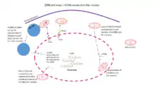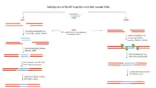 NUMT insertion into the nuclear genome and its persistence in the nuclear genome initiated by the physical delivery of mitochondrial DNA to the nucleus.[5] This step follows by the mtDNA integration into the genome through a non-homologous end joining mechanism during double-strand break (DSB) repair process as envisioned by studying baker's yeast, Saccharomyces Cerevisiae;[13][29] and terminates by intragenomic dynamics of amplification, mutation, or deletion, which also known as post-insertion modifications.[5] The mechanism of mtDNA transfer into nucleus is not yet fully understood.