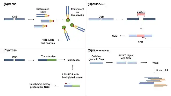 BLESS is the easiest way to detect and quantify off-target mutations by screening for DSBs in the genome. This method relies on direct in situ breaks labeling enrichment on streptavidin. Developed in 2013,[48] BLESS is performed by ligating the DSB ends with biotin i.e. biotinylation. This is followed by separation/collection of said ligated ends using streptavidin. A linked sequence is added to the biotinylated sequences and this final mix is then sequenced to yield the position of the off target mutation. Being unbiased in nature, BLESS gives information about site of mutation within the genome rather than the proteins involved or associated with the DSBs. However, BLESS can only detect mutations at the time of experiment and not the ones which were formed earlier and were repaired.[49]