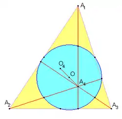 The incenter of this common orthic triangle must be one of the original four orthocentric points. Furthermore, the three remaining points become the excenters of this common orthic triangle. The orthocentric point that becomes the incenter of the orthic triangle is that orthocentric point closest to the common nine-point center. This relationship between the orthic triangle and the original four orthocentric points leads directly to the fact that the incenter and excenters of a reference triangle form an orthocentric system.[3]