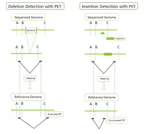 1. DNA-PET: Because PET represent connectivity between the tags, the use of PET in genome re-sequencing has advantages over the use of single reads. This application is called pairwise end sequencing, known colloquially as double-barrel shotgun sequencing. Anchoring one half of the pair uniquely to a single location in the genome allows mapping of the other half that is ambiguous. Ambiguous reads are those that map to more than a single location. This increased efficiency reduces the cost of sequencing as these ambiguous sequences, or reads, would normally be discarded. The connectivity of PET sequences also allows detection of structural variations: insertions, deletions, duplications, inversions, translocations.[1][4] During the construction of the PET library, the fragments can be selected to all be of a certain size. After mapping, the PET sequences are thus expected to be consistently a particular distance away from each other. A discrepancy from this distance indicates a structural variation between the PET sequences. For example (Figure on the right): a deletion in the sequenced genome will have reads that map further away than expected in the reference genome as the reference genome will have a segment of DNA that is not present in the sequenced genome.