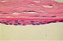 Posterior polymorphous corneal dystrophy (PPCD; sometimes also Schlichting dystrophy) is a type of corneal dystrophy, characterised by changes in Descemet's membrane and endothelial layer. Symptoms mainly consist of decreased vision due to corneal edema. In some cases they are present from birth, other patients are asymptomatic. Histopathological analysis shows that the cells of endothelium have some characteristics of epithelial cells and have become multilayered. The disease was first described in 1916 by Koeppe as keratitis bullosa interna.[1]