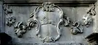 The inscription was transcribed by the Devon topographer Rev. John Swete (d. 1821) in his "Journals".[16] On the sides of the base of the statue are identical heraldic escutcheons showing the arms of Robert Rolle impaling the arms of Duke, Per fesse argent and azure, three chaplets counterchanged, for his wife Elizabeth Duke (d. 1716), daughter of Richard Duke (1652–1733),[17] MP, of Otterton, Devon.