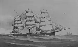 The ship was due to take on passengers from Plymouth, but was caught in heavy weather, and the captain decided to take refuge at Spithead near Portsmouth. The London eventually docked in Plymouth. The ship then restarted the journey to Australia on 6 January 1866. There were 263 passengers and crew aboard, including six stowaways. On the third day out while crossing the Bay of Biscay in heavy seas the cargo shifted and her scuppers choked, forcing the vessel lower in the water where she was swept by tremendous seas. Water poured down the cargo hatches extinguishing her fires and forcing the captain to turn about and return once more toward Plymouth. In so doing he headed into the eye of a storm. On 10 January, after a considerable buffeting over several days, a sea carried away the port life boat; then at noon another wave carried away the jib-boom, followed by the fore topmost and main royalmast with all spars and gear. On 11 January a huge wave crashed on deck, smashing the engine hatch which resulted in water entering the engine room putting the fires out. By 12 January her channels were nearly level with the sea and a decision was made to abandon ship. The life boats were swamped as soon as launched, with only one craft staying afloat. Nineteen people escaped on the life boat, only three of whom were passengers. When the boat was a hundred yards away from the ship, the London went down, stern first. As she sank, all those on deck were driven forward by the overpowering rush of air from below, her bows rose high till her keel was visible and then she was "swallowed up, for ever, in a whirlpool of confounding waters". The London took with her two hundred and forty-four persons. It was reported that the last thing heard from the doomed ship was the hymn "Rock of Ages".[4] The nineteen people who got away in her cutter were the only ones saved. They were picked up next day by the barque Marianople and landed at Falmouth.[5]