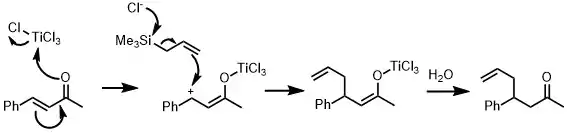 [4] The Hosomi-Sakurai reactions are allylation reactions which involve use of allyl silanes as allylmetal reagents. This section demonstrates examples of allylation of diverse ketones. In figure 1, allylation of a carbonyl ketone (compound containing a ketone group and two different functional groups) has been shown. In the given reaction, the electrophilic compound (carbon with a ketone group) is treated with titanium tetrachloride, a strong Lewis acid and allyltrimethylsilane. According to the general principle, the Lewis acid first activates the electrophilic carbon in presence of allyltrimethylsilane which then undergoes nucleophilic attack from electrons on the allylic silane.[5] The silicon plays the key role in stabilizing the carbocation of carbon at the β-position. Hosomi-Sakurai reaction is also applicable for other functional groups such as enones, where conjugate addition is usually seen. In figure 2, the Hosomi- Sakurai reaction has been shown using a cinnamoyl ketone. This reaction follows the same mechanism as the previous reaction shown here.