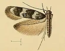 The wingspan is 7โ10 mm. The forewings are black, with a few greyish white scales at the base and two greyish white transverse bands. The hindwings are dark leaden grey.[2]